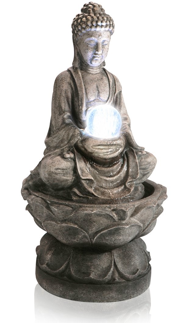 This antique, granite-effect Buddha will make a wonderful addition to your garden, conservatory, or any other indoor or outdoor area. It features a crystal-like sphere that amazingly appears to float in the palms of his hands, casting a magical glow as the LED lights delicately highlight the feature. Watch the water calmly flow through the Buddha's hands and slowly cascade down the front of his robe into the delightful flower reservoir below.